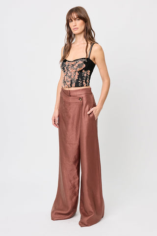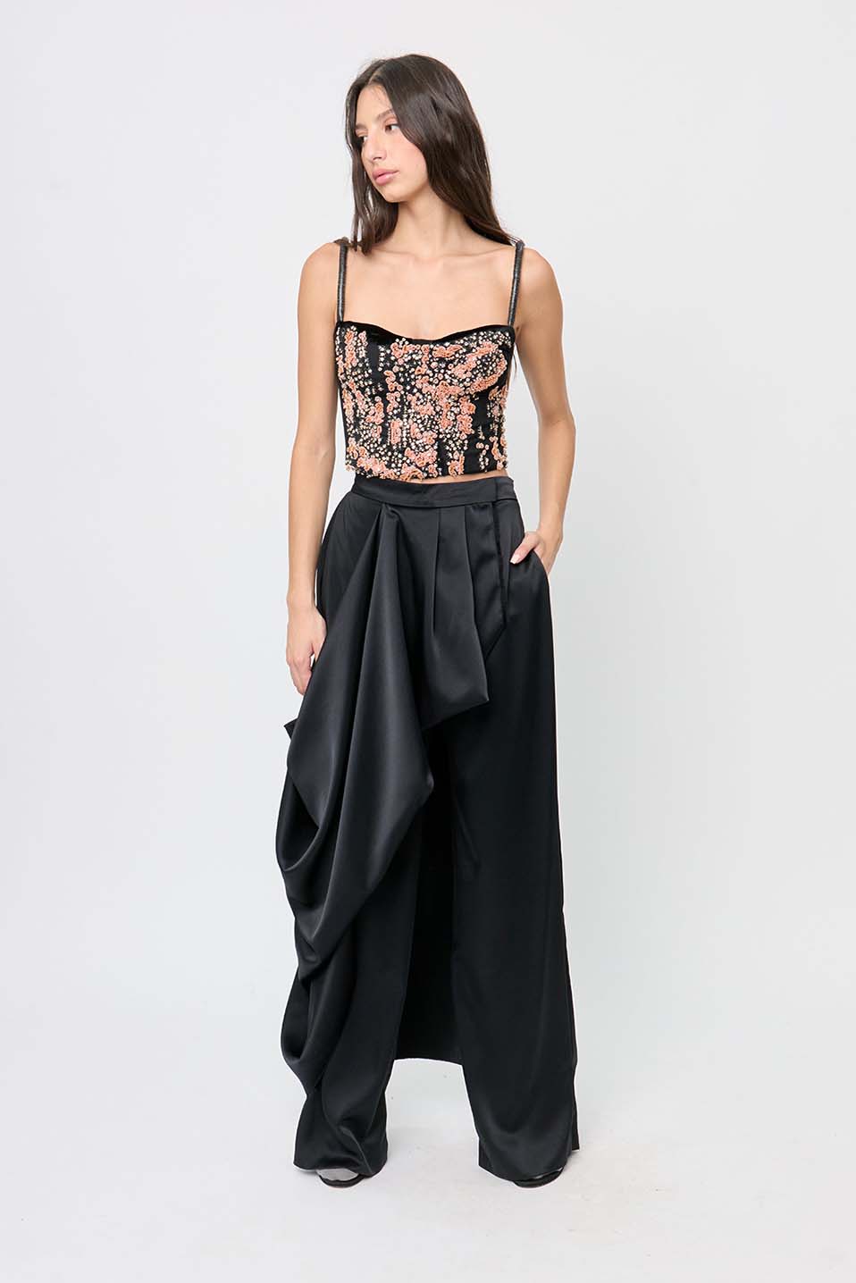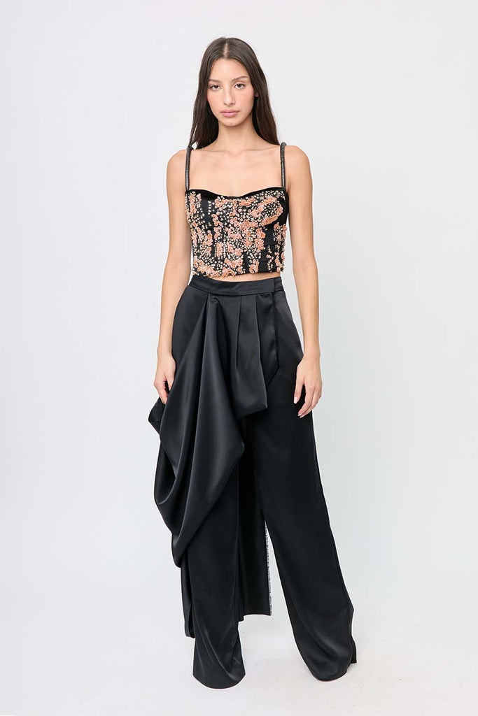 Achieve a stunning look with the Bejewelled Bustier, hand-embroidered with floral detailing on crepe fabric. This elegant piece is crafted to exude both power and beauty. Pair it with our burn vest for an elevated took.