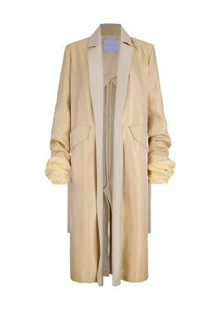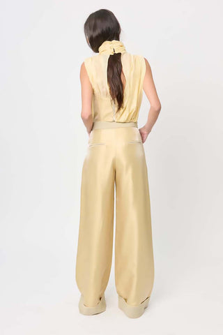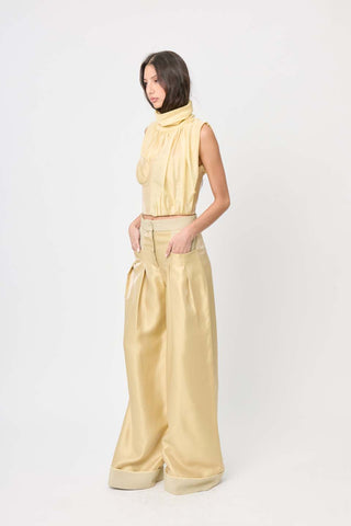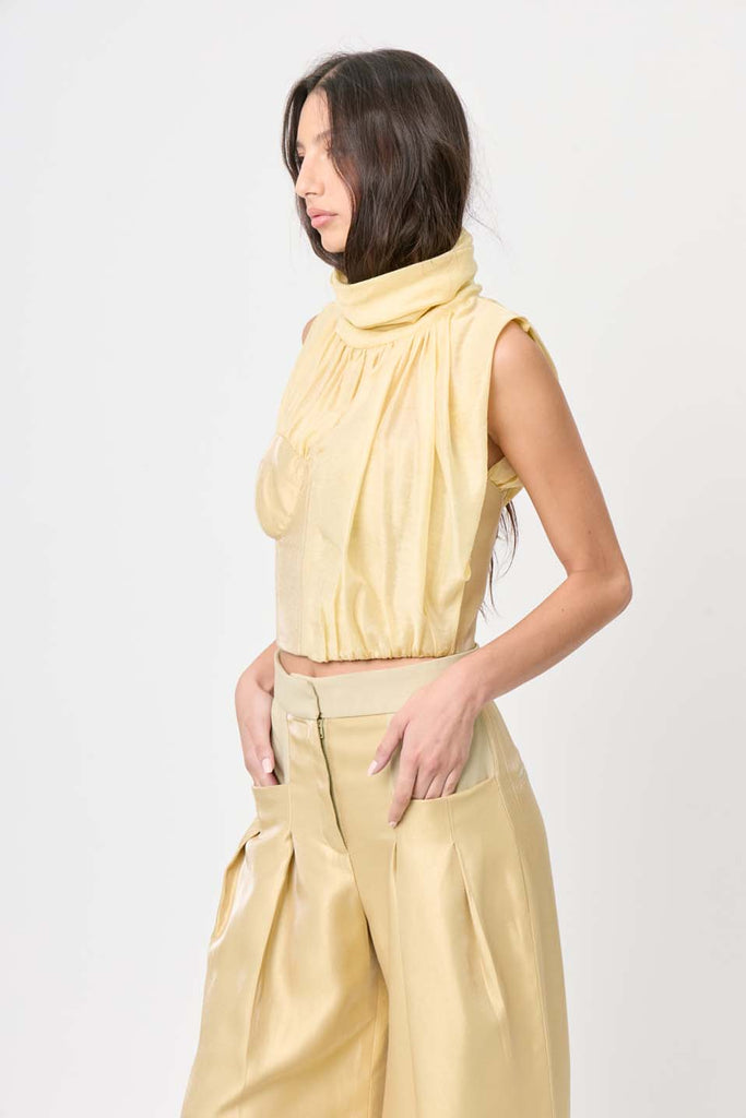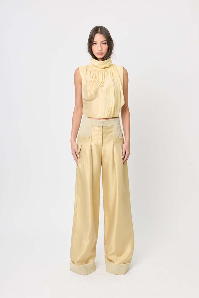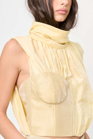Experience elegance with the Brave Bustier, an asymmetrical draped high-neck bustier made of crepe and gauze fabric in the color butter. This bustier combines modern design with a refined edge, making it a versatile addition to your wardrobe. Pair it with our Fierce pant and our ashes coat for a complete look.