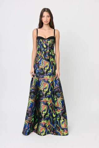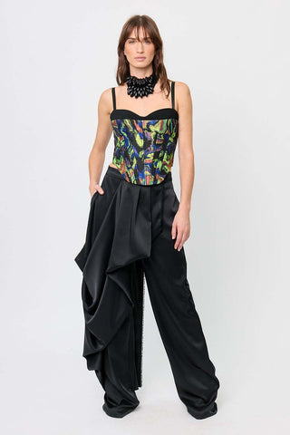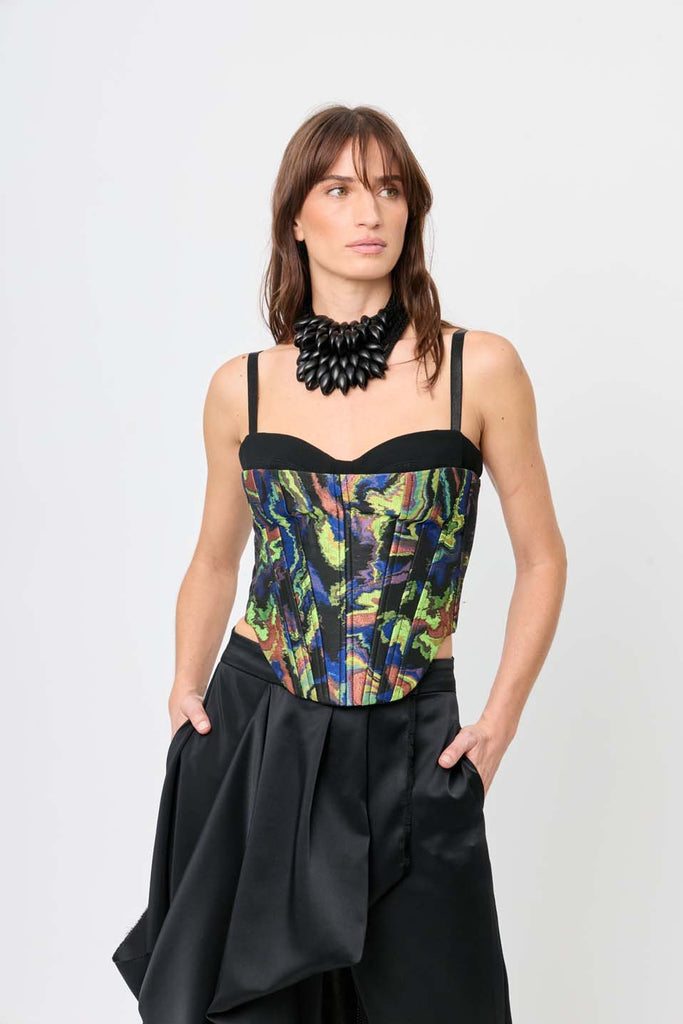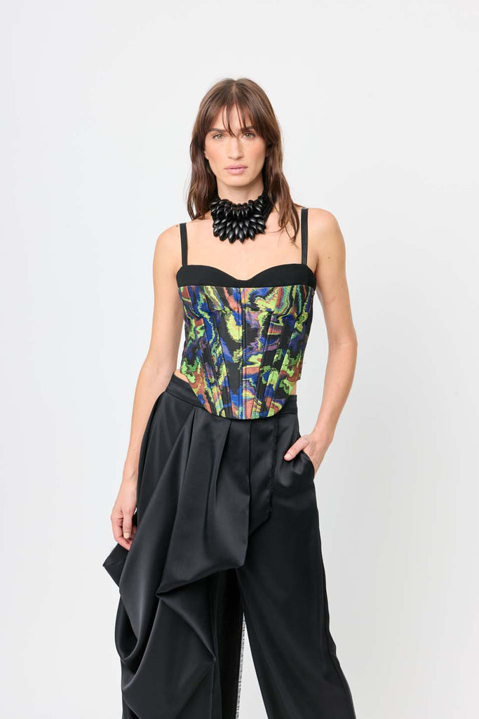 Made with jacquard and crepe fabric, the colorful Zodiac bustier with straps is designed to accentuate the waist. Perfect for evening events, cocktail parties, nights out, or even a casual look. Pair it with our ritz pant for a full look.
