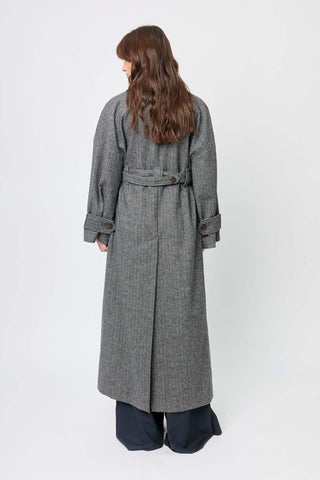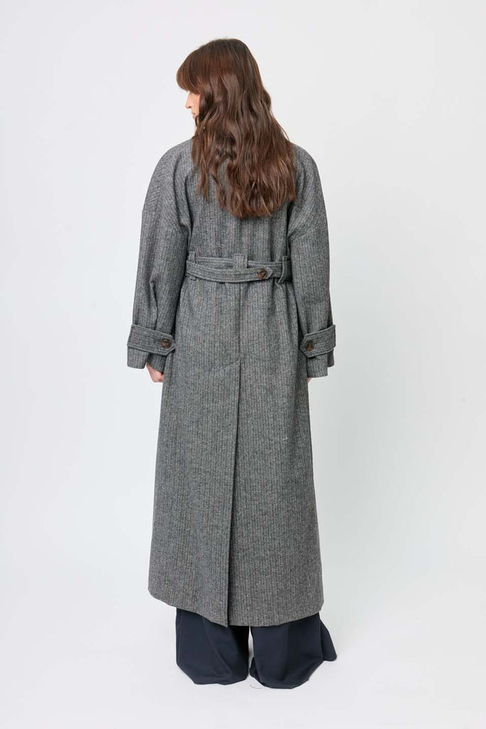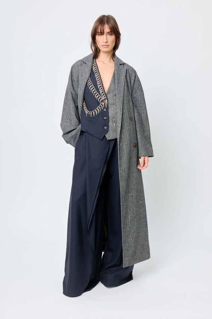 Make a lasting impression with our oversized Drakonda Coat. It is an oversized coat made by wool. It is made in dark grey making a standout design, this coat is perfect for making a memorable impression at any event. Style it with the Buttefish pants.