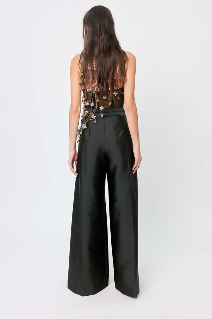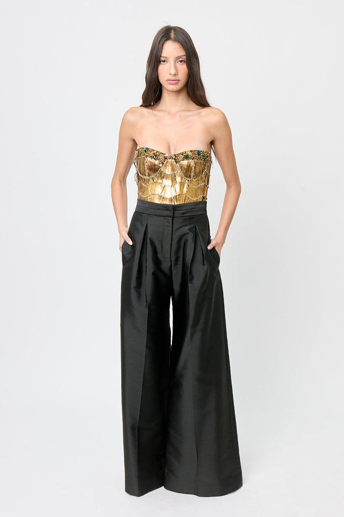 Inspired in our iconic Ritz pant, the Gazar fabric version is a larger-than-life silhouette. Structured, high-waisted and with a wide-leg, it can be worn with our hand-embroidered Jazz bustier for a cocktail night.