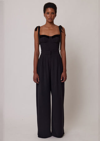 A wardrobe essential, this single pleat high-waisted pant with a flowy wide-leg silhouette in black crepe. Pair it with a bustier for an elegant yet effortless style.