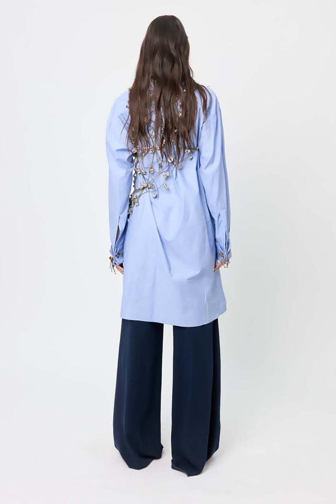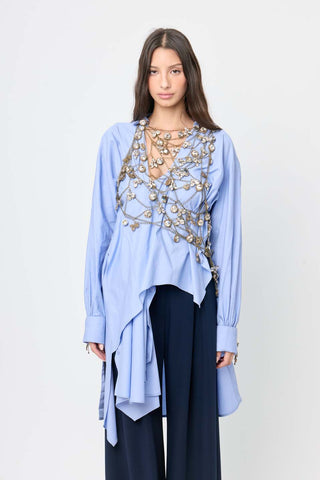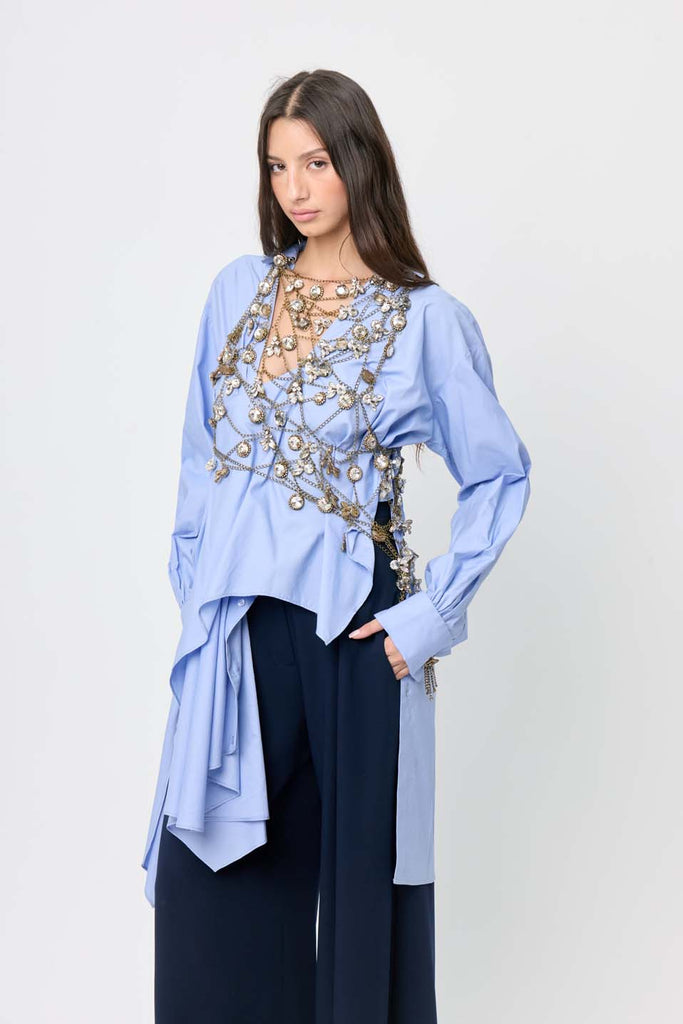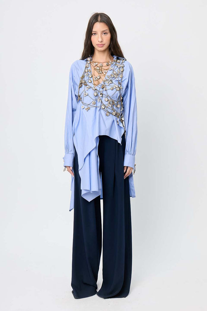 An asymmetrical, draped, and sophisticated piece, our Wings Shirt in blue is perfect for a monochromatic look that transitions effortlessly from day to night. Pair it with our Lakas pant and our legendary scarf for a full look.