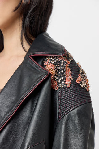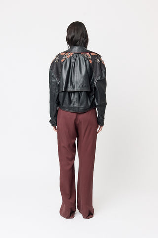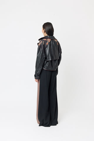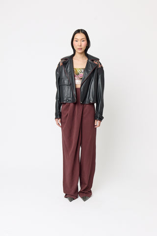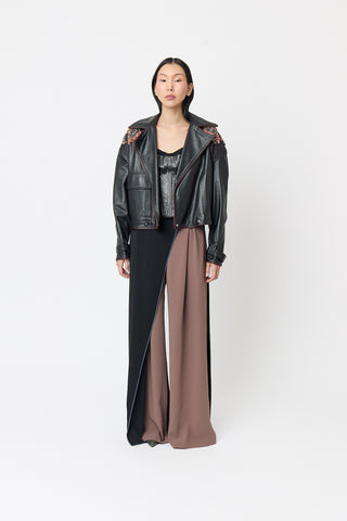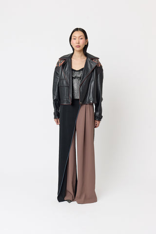 Elevate your edge with our metallic black leather Alchemy Jacket. This biker-style jacket is ideal for cooler evenings, business casual meetings, or as a standout item in a layered outfit. Pair it with our ashes top and our tuna skirt for a complete look.