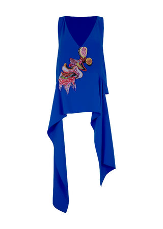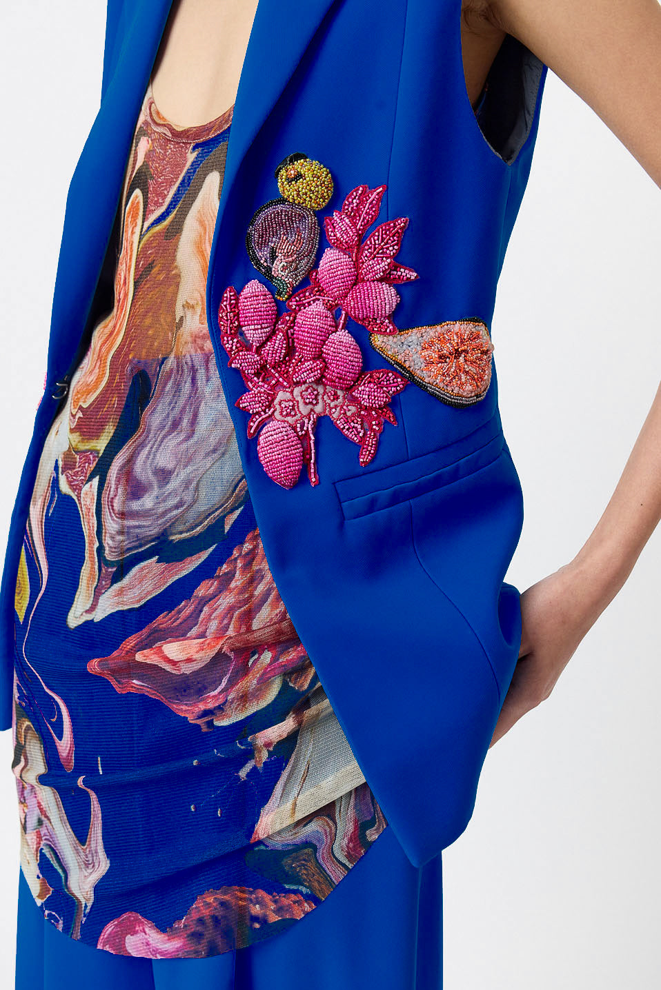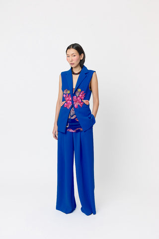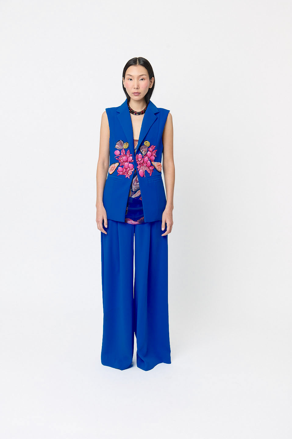 Elevate your basics with a touch of glamour, introducing our Bouquet Vest, a wardrobe essential with a twist. Crafted from bottle blue crepe with embroidery, this piece embodies understated elegance and everyday luxury. Pair it with our Ritz pants for a full look.
