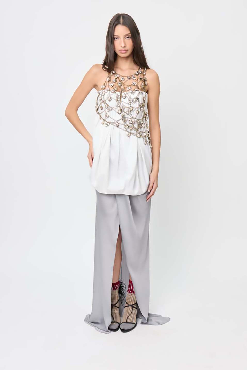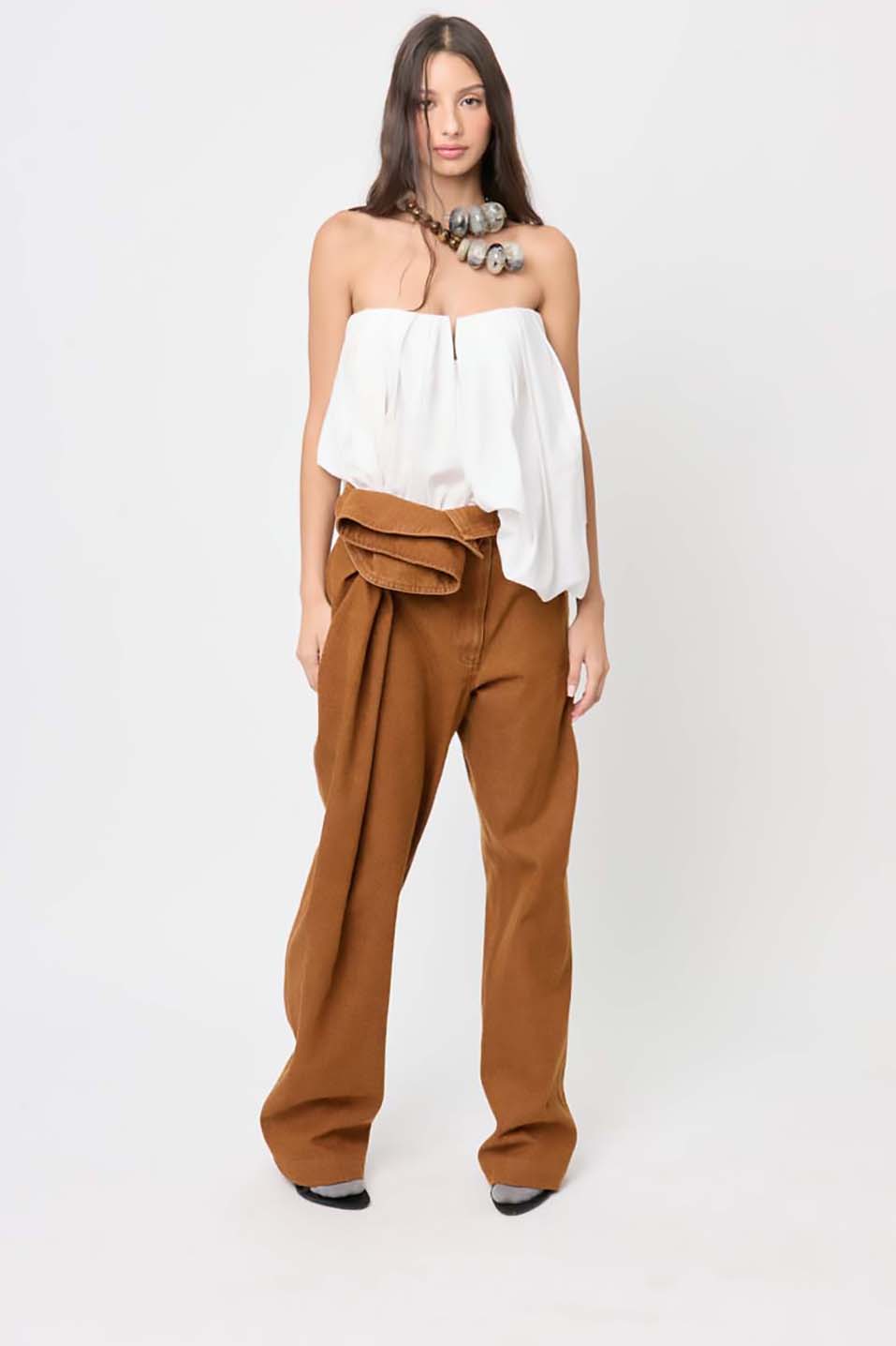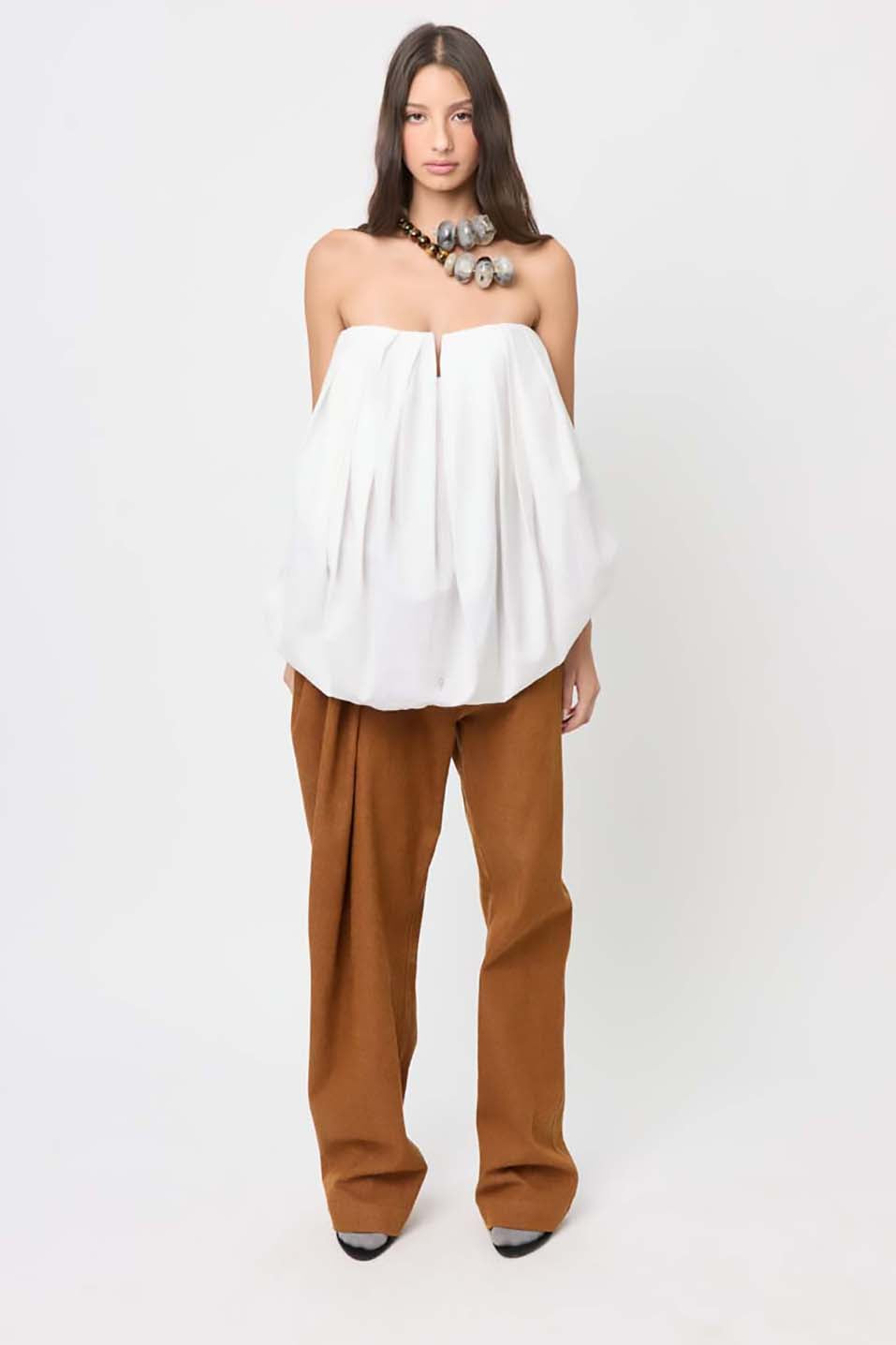 Experience elegance with the Gen Bustier, a draped strapless bustier made of cotton fabric in white. This bustier combines modern design with a refined edge, making it a versatile addition to your wardrobe. Pair it with our Plasa skirt and our treasure top for a striking and complete look.