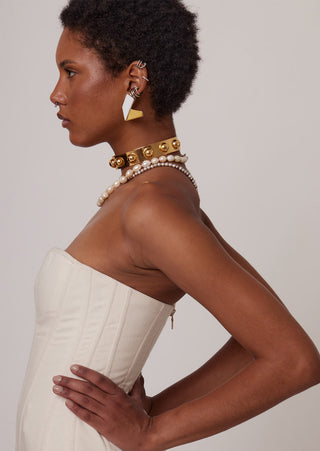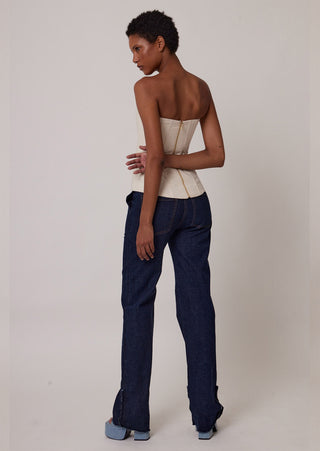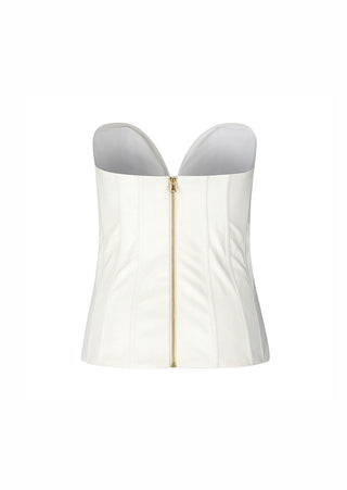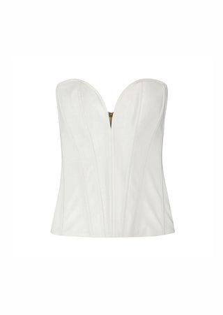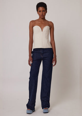 The latest intepretation of Sandra, a new statement of the brand. This strapless bustier with a heart-shape cleavage in Ivory cotton will be a must-have of the season. Pair with our Toxic pant for a modern outcome.