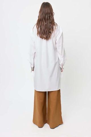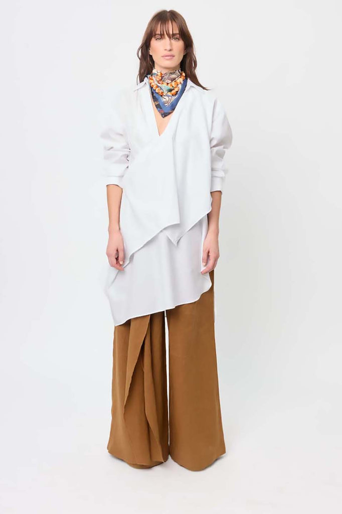 An asymmetrical, draped, and sophisticated piece, our Wings Shirt in white is perfect for a monochromatic look that transitions effortlessly from day to night. Pair it with our Lakas pant and our legendary scarf for a full look.