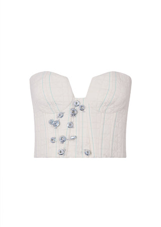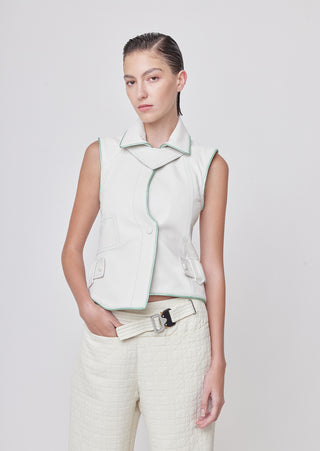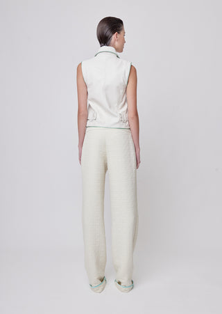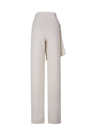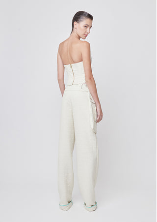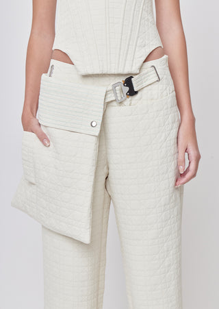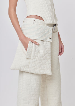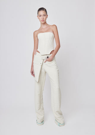 Straight-legged pant in ivory, featuring a belt bag for a modern and functional touch. Style with the Tech Bustier and Sim Blazer for a bold, contemporary look.