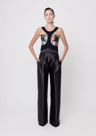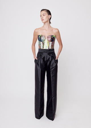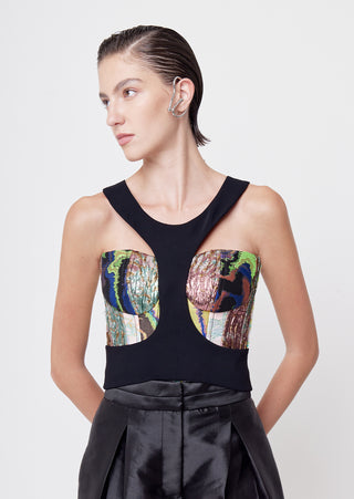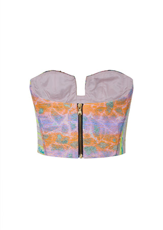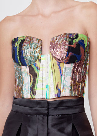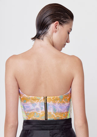 New season, new silhouettes! A bolder spirit comes to life in this strapless bustier with a plunging cleavage made of a collage of mixed jacquard in our Affix color that will make any of your looks a show-stopper.