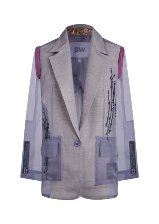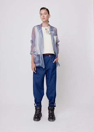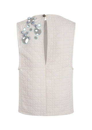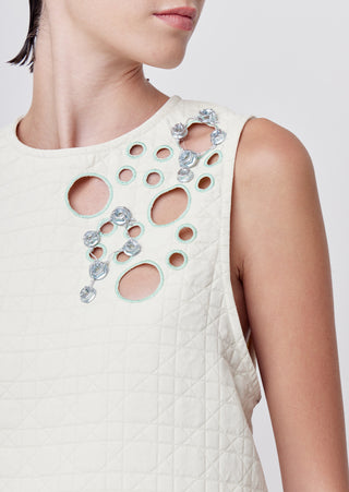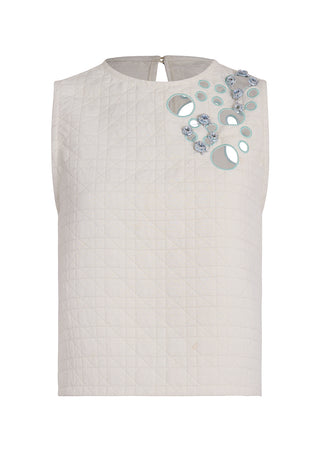 The Code top is a sleeveless top with quilted fabric in ivory that offers a modern, breathable feel. The pleated details add a touch of sophistication. Styled with our Astro pants for a cohesive look.