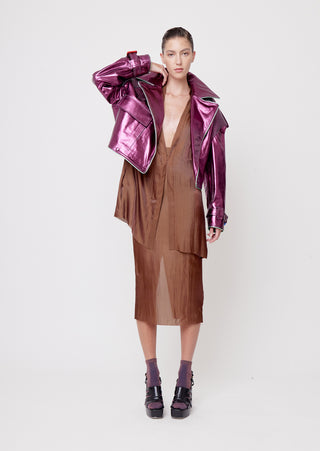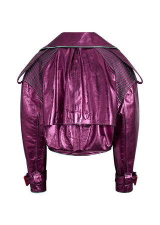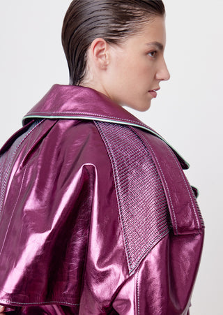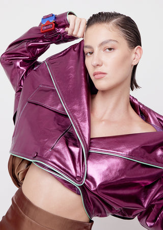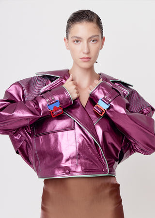 Elevate your elegance with our metallic fucsia leather DNA Jacket. This piece is a relaxed double-breasted jacket offering A modern take on classic tailoring, this piece is ideal for cooler evenings, business casual meetings, or as a standout item in a layered outfit. It pairs well with the Ikehu skirt for a formal look or the Naut Jeans for a more casual vibe.