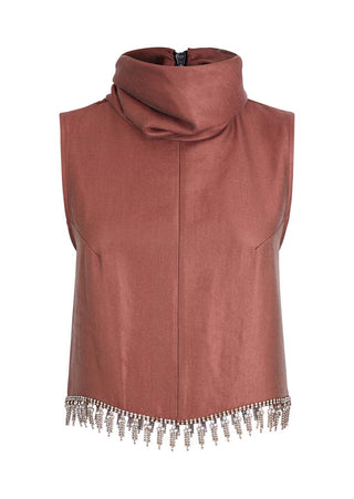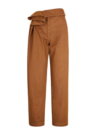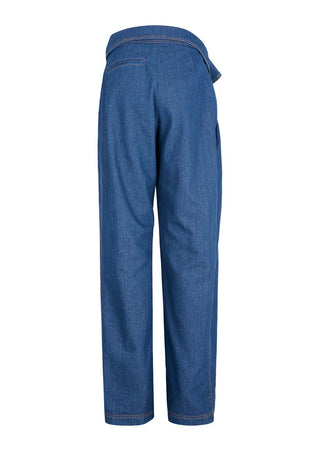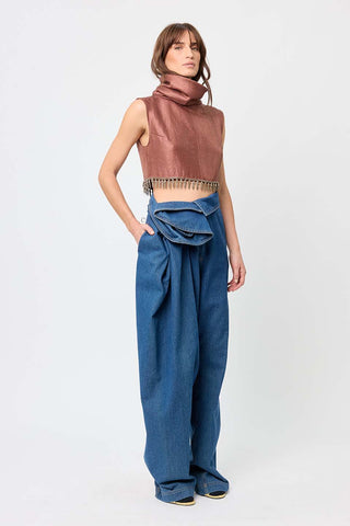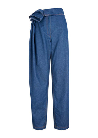 Now a new style; this draped loose-fit pant with a unique front draped in dark blue is a wardrobe essential. Wear it with the collage bustier for a unique look.