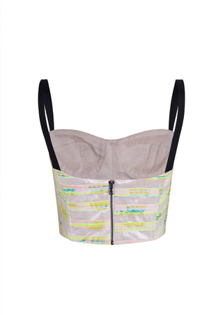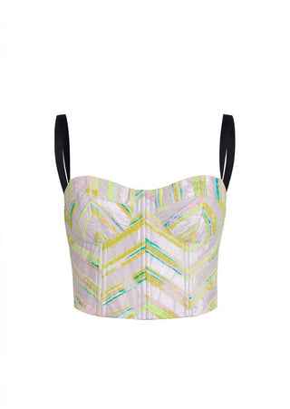Achieve a commanding look with the Neon Bustier, expertly crafted from jacquard in a blend of neon colors. This striking piece is designed to exude sophistication. It is ideally styled with our Kao Pant in white denim.