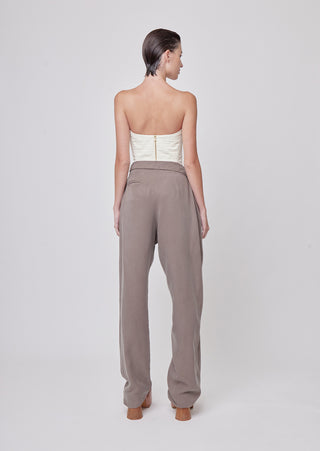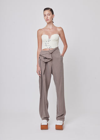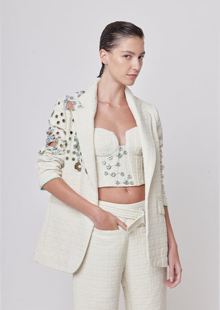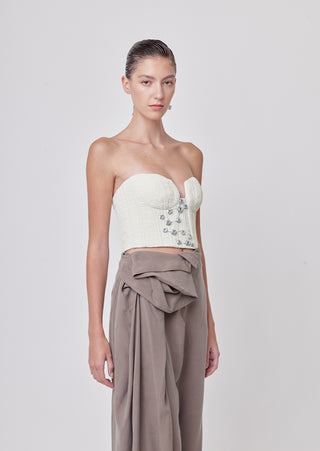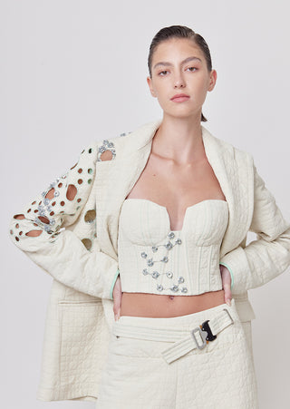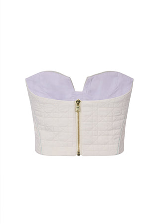 New season, new silhouettes! A bolder spirit comes to life, in this strapless bustier, made of quilted ivory fabric brings a bolder spirit to life. Its plunging cleavage will make any look a show-stopper.