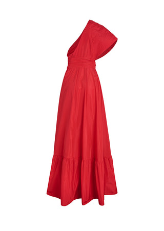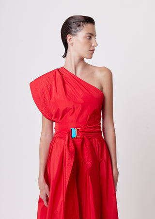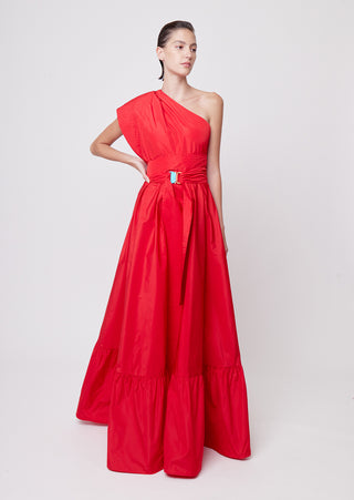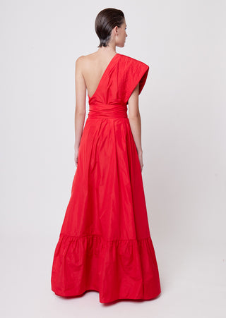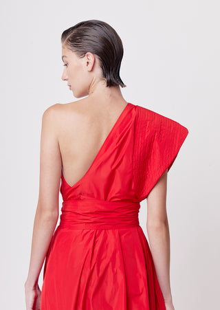 The Vibe dress is a one-sleeve long dress crafted in taffeta in red allowing for a bold statement. It can be worn for a special occasion.