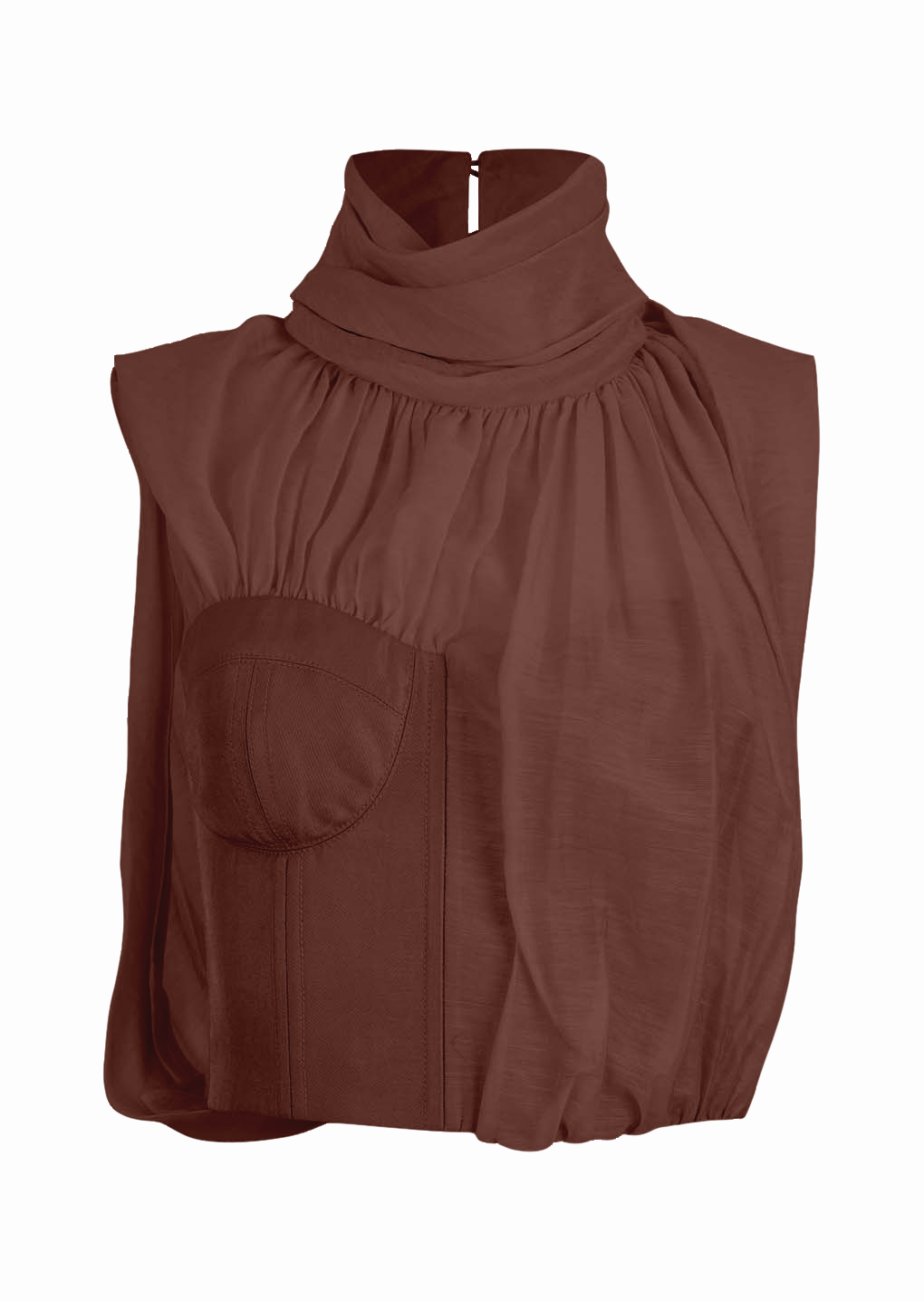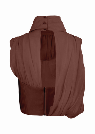 Experience elegance with the Brave Bustier, an asymmetrical draped high-neck bustier made of crepe and gauze fabric in the color cinnamon. This bustier combines modern design with a refined edge, making it a versatile addition to your wardrobe. Pair it with our fierce pant and our ashes coat for a full look.
