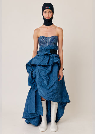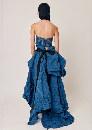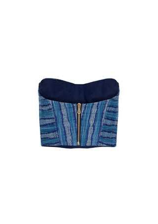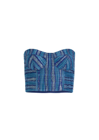 Strapless and chic, this season’s Collage bustier in striped blue jacquard with a touch of metallic shine. For a bold look, pair it with a statement piece like the Parachute skirt.