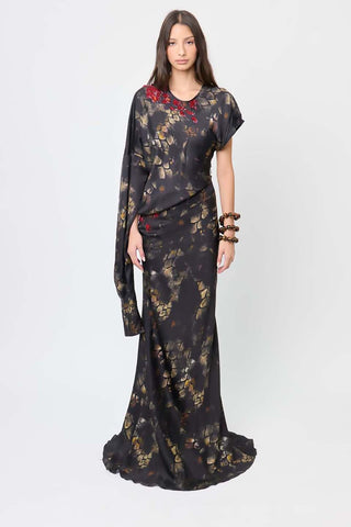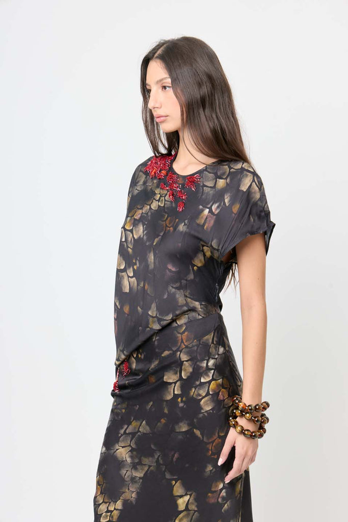 Step into the spotlight with our Dragon Scales Print Long-Sleeve Draped Maxi Dress—a masterpiece of style and allure. Crafted from lightweight and breathable viscose, this dress features a captivating Scales print, offering a unique blend of sophistication and artistic expression.