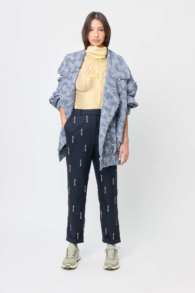 As their name suggests, these Fierce Pants are a standout piece in their own right. The distinctive texture of the Combed Wool fabric in Navy adds a unique and sophisticated touch to any outfit. With their elegant design and high-quality material, these pants offer a refined and stylish option for a range of occasions, ensuring you look polished and chic. Pair it with our brave bustier and our ashes coat for a full look