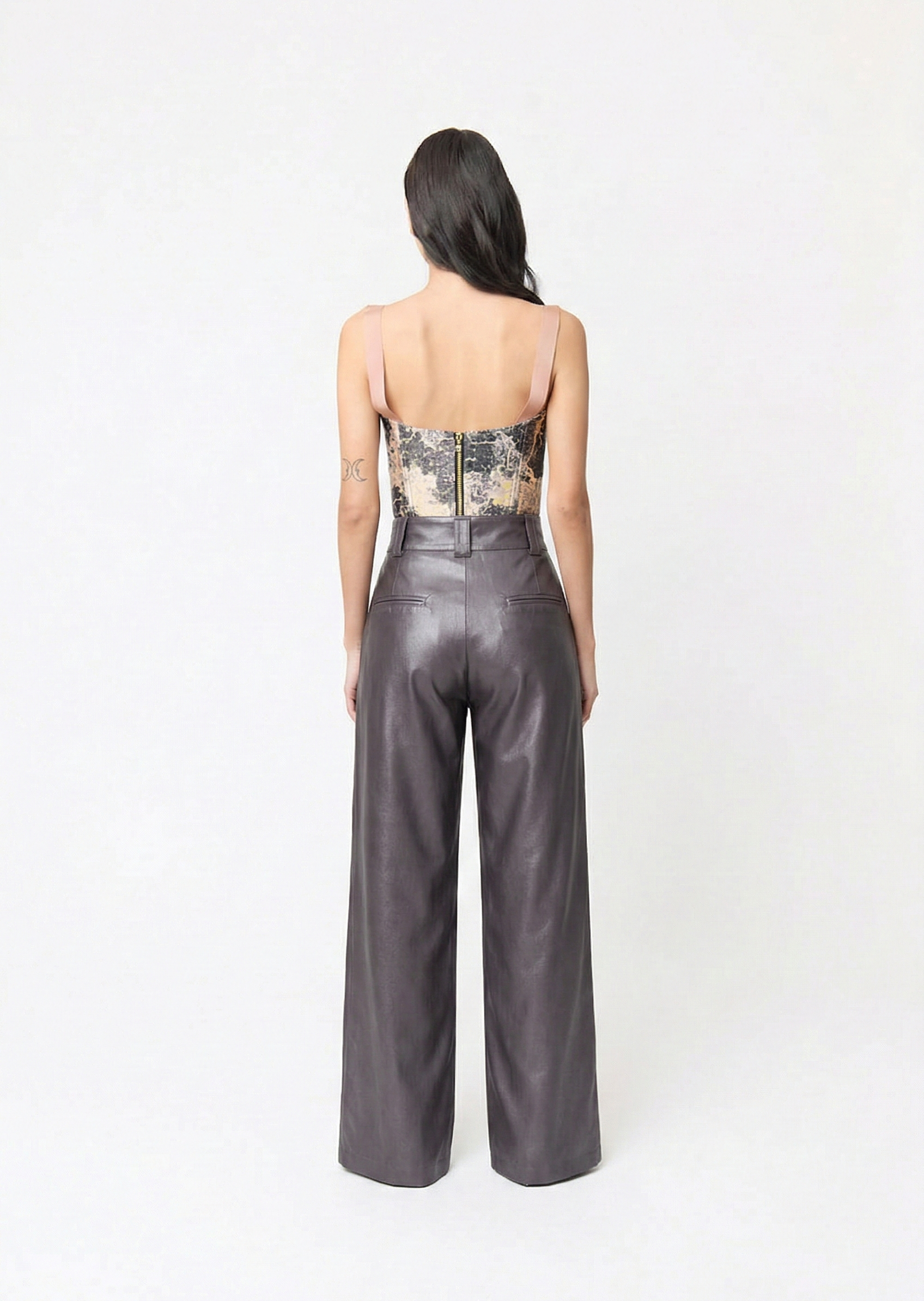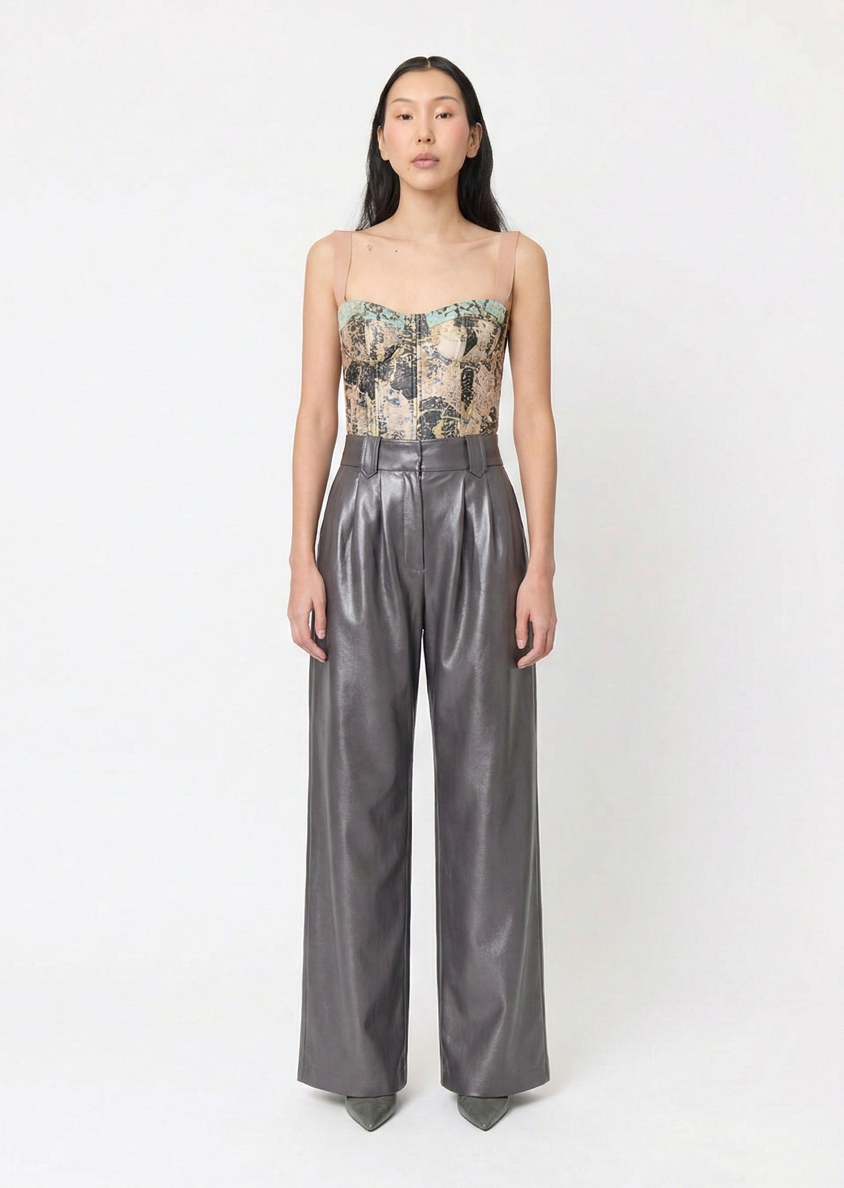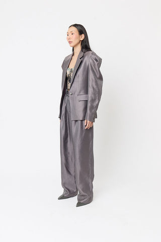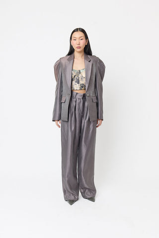 Pair these front-side panel high-waisted slim-fit pants with our Collage Bustier. Crafted from crepe fabric in gunmetal color, this coordinated ensemble captures attention with its harmonious blend of style and color.